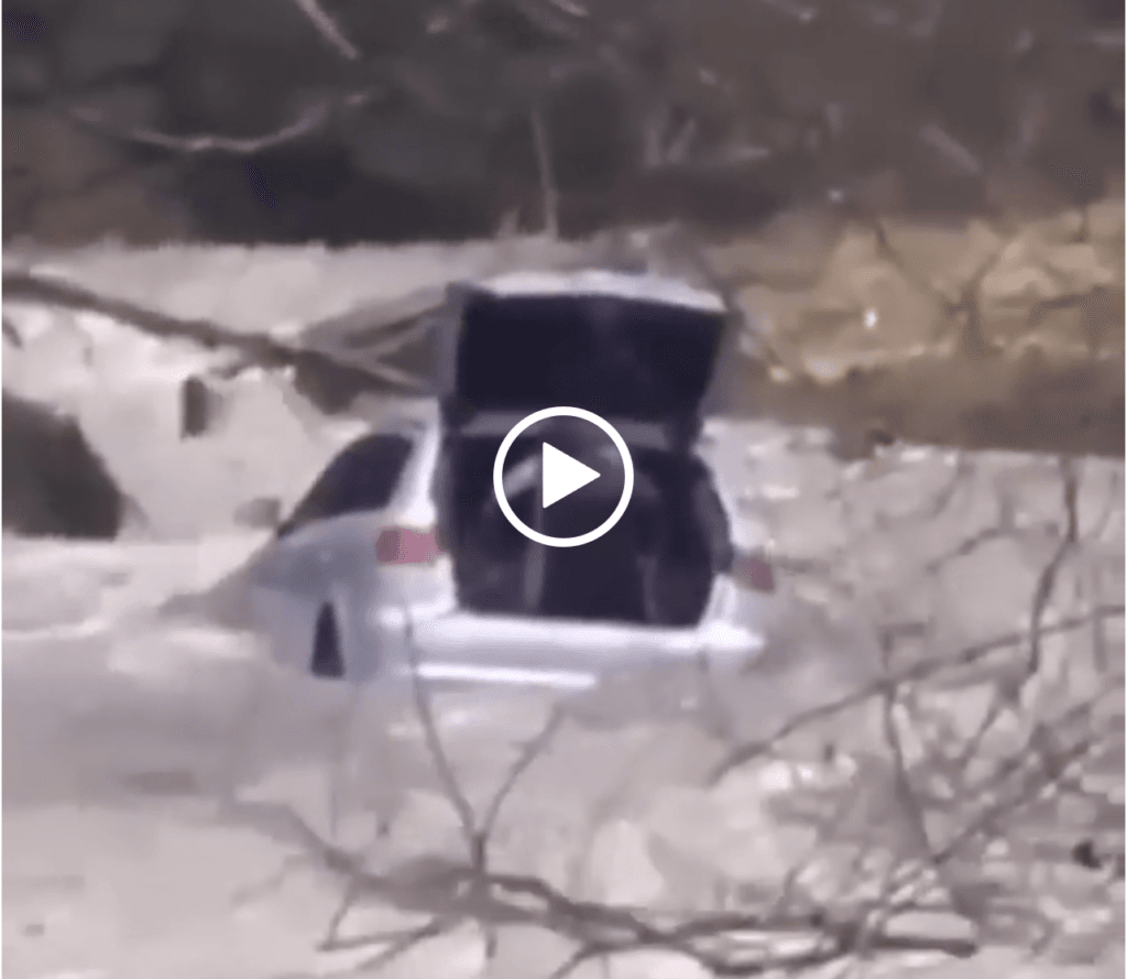 The driver accelerates, enters the water and the car is carried over, breaks the bridge and then stops stuck in a boulder. The young man is later filmed already sitting in the trunk. Immediately after filming he was rescued by the firemen and the car overturned.