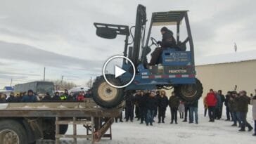 The forklift operator in this video was bad luck because the cargo was very bulky, the truck was very close to it and had to climb the pavement passing over the curb.